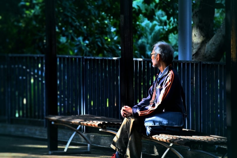 Nothing much was happening in the picture. There was no tears or obvious sadness on his face. Just a quiet afternoon scene; trees in the background, people walking past in the distance, and an old man sitting still as the world continued moving around him.