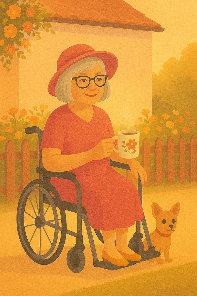 Photo credit: Always in her wheelchair, always wearing some cheerful shade of pink, with a tiny Chihuahua either perched regally in her lap or trotting valiantly beside her (Image created using Google Gemini)